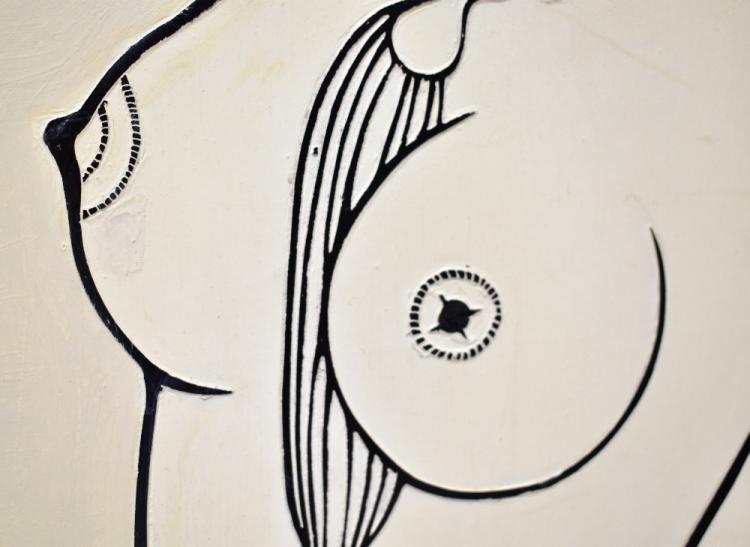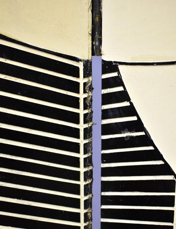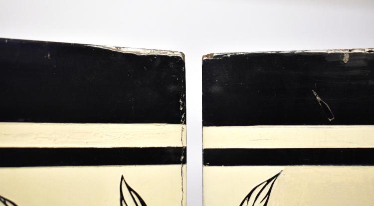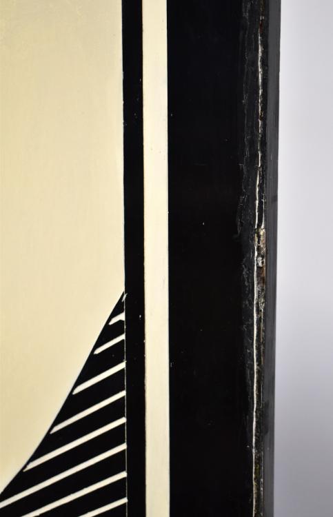 Lot 20 of 1493: An Art Deco style black lacquered and cream decorated four-panel three-fold screen depicting a semi-nude female with ornate feathered headdress and two further seated nude females in an interior scene, 183 x 165cm.