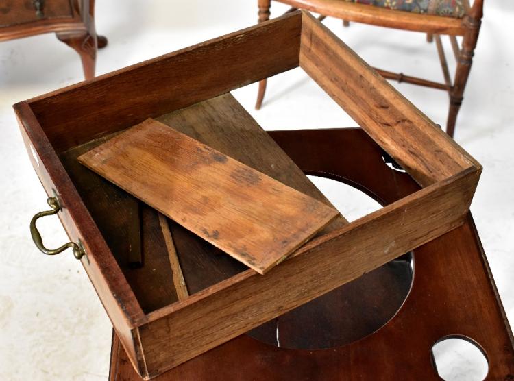 Lot 21 of 1493: A William IV mahogany bar back dining chair with overstuffed seat upholstered in tartan fabric, together with a Victorian walnut bergère backed carver dining chair with drop-in seat, on turned legs, a 19th century mahogany two-tier wash stand, square top with cut-outs for bowl, etc (af), height 80cm, and a reproduction walnut bow-front bedside cabinet of three drawers on cabriole legs, height 71cm (4).