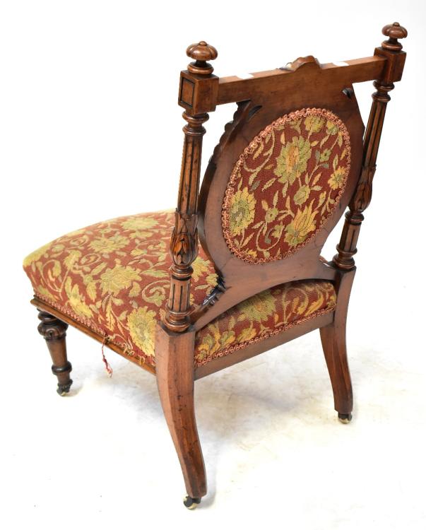 Lot 22 of 1493: A Victorian walnut nursing chair, circular pad back rest with bow and swag decoration, to overstuffed seat and front turned supports and castors.