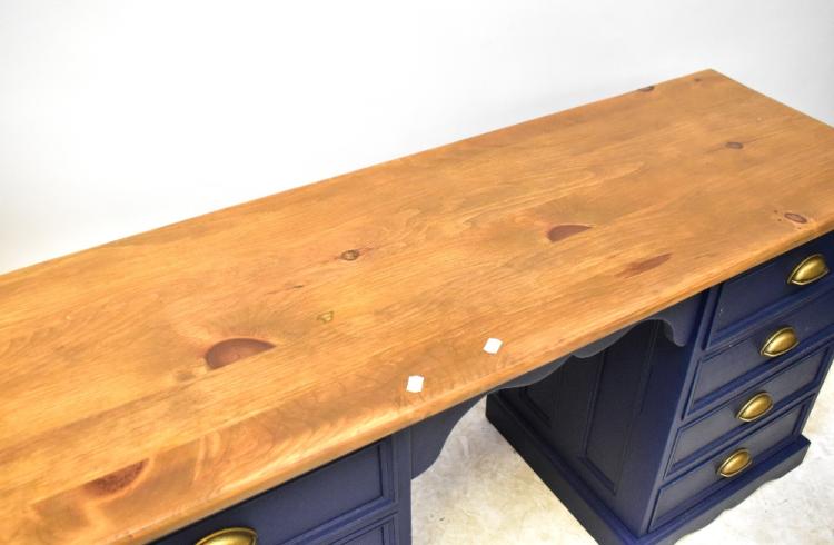 Lot 26 of 1493: A twin pedestal desk with varnished top and painted blue base, each pedestal with four drawers, on plinth bases, 76 x 153 x 50cm.