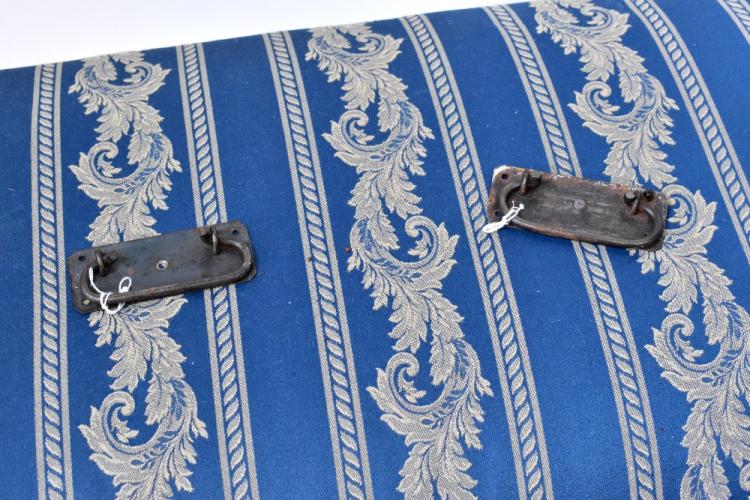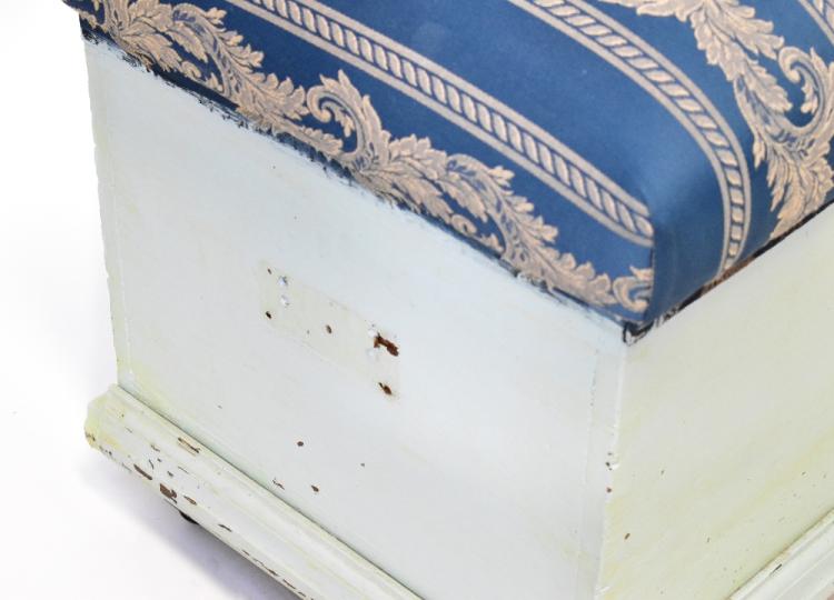 Lot 35 of 1493: A pale blue painted pine ottoman with upholstered hinged lid, raised on castors, 56 x 90 x 47cm.