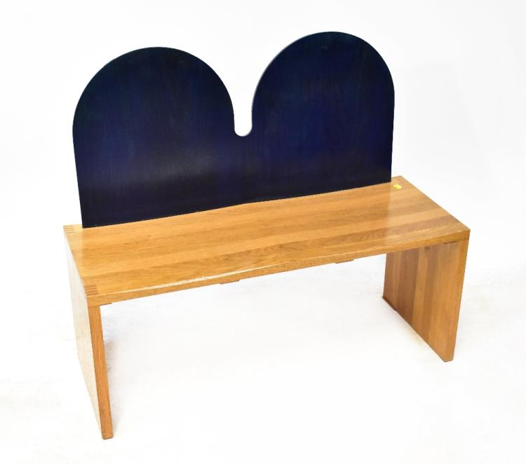 Lot 41 of 1493: A modern stylised bespoke made oak table with an extending D-shaped small flap either end, stained red, length when extended 160cm, and two matching oak bespoke made benches with dovetail joints and blue stained plywood backs, length of benches 103cm.