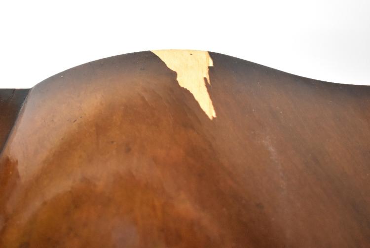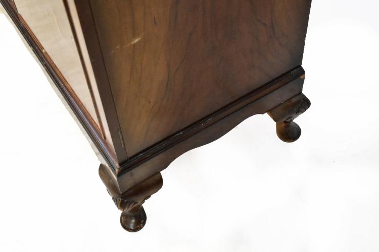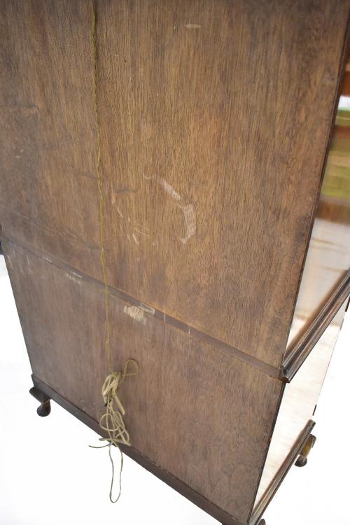 Lot 47 of 1493: A mid-20th century crossbanded burr walnut veneered double dome topped cocktail cabinet, with ornate lock escutcheons, the upper section with pair of panelled doors enclosing a mirrored interior with single glass shelf, mirrored brush-in slide, above further pair of panelled doors, raised on squat cabriole legs to pad feet, 158.5 x 92 x 44cm (af).