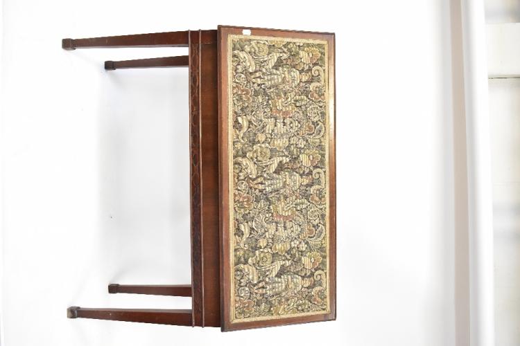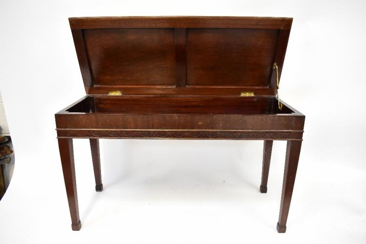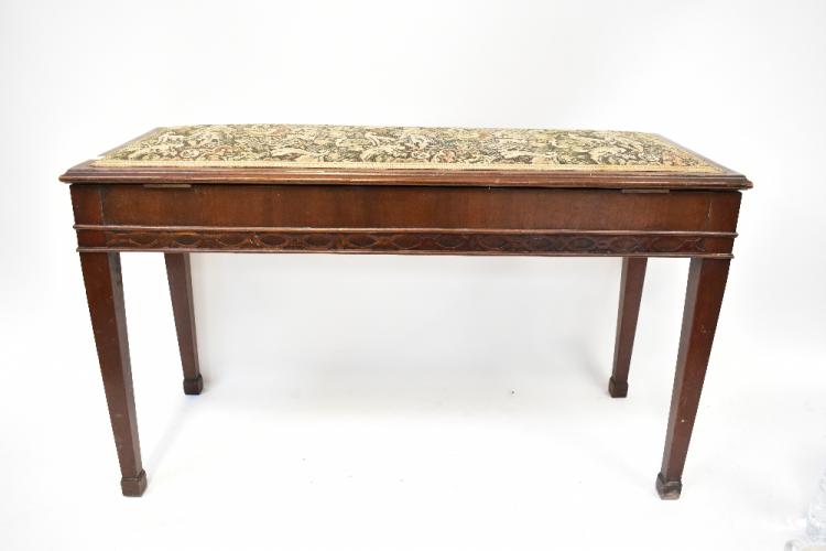 Lot 51 of 1493: A mahogany piano duet stool with tapestry-style upholstered lift-up seat, and with stopped fretwork decoration on square tapering legs, 55 x 93 x 39cm, together with one other mid-20th century piano stool with lift-up lid and twin turned rails (2).