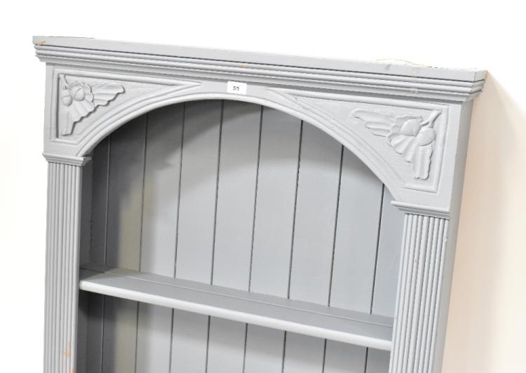 Lot 55 of 1493: A grey painted wall hanging shelf unit, panelled back and two drawer, carved acorn and oak leaf decoration, 100 x 88 x 19cm.