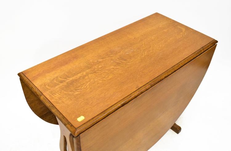 Lot 56 of 1493: A good quality oak reproduction gateleg table of oval shape, with baton gateleg united with wavy stretcher, the table ends of vase shape and cut-out centred teardrops, on stepped base, 72 x 146 x 91cm.