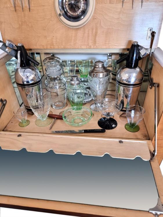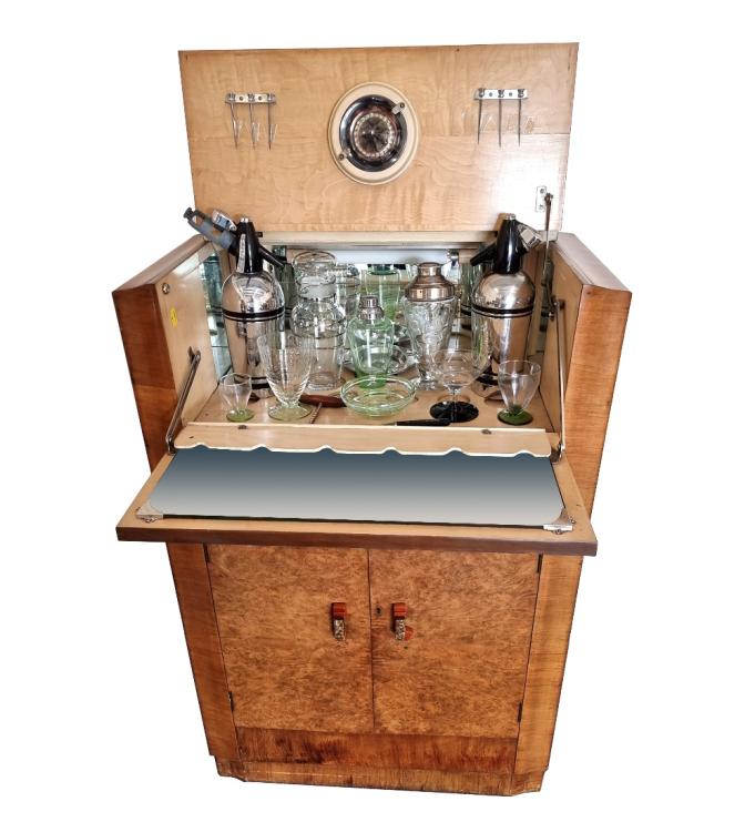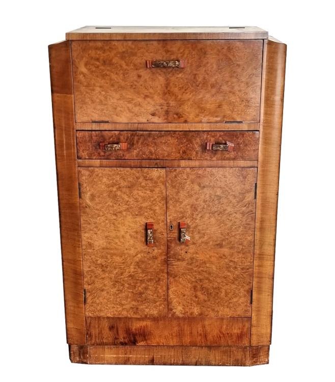 Lot 75 of 1493: A 1930s Art Deco burr walnut veneered cocktail cabinet, the top section with cantilever drop-front and lift-up doors, enclosing a mirrored bottle section with recessed cut-outs, the top flap with central located lemon squeezer, flanked by two brackets of three thistle-shaped cocktail sticks, the drop flap with mirrored surface with possible glass holders, over a single cutlery drawer, over two-door cabinet with shelf and bottle holders, Art Deco inspired Bakelite handles to the front, 111 x 70 x
