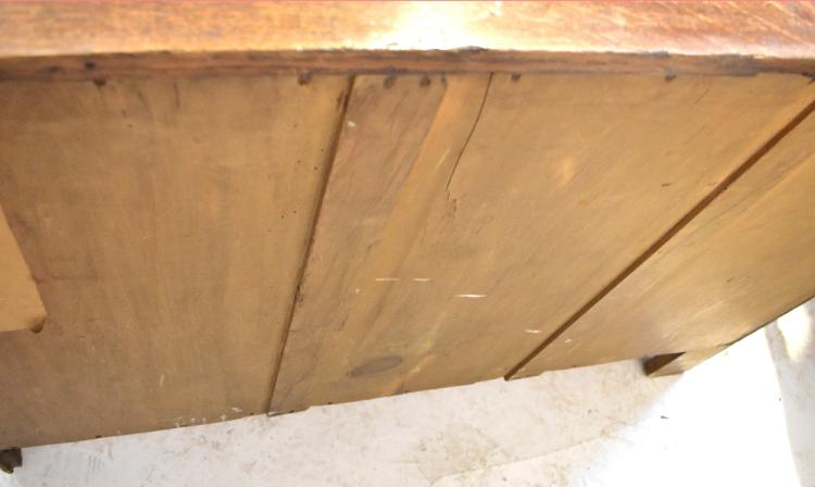 Lot 77 of 1493: A Georgian oak three-drawer chest with moulded top above three long drawers, shaped apron and raised on outswept square tapering supports, with brass escutcheons and drop loop handles, 92 x 123 x 60cm.