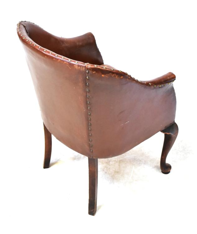 Lot 78 of 1493: A late 19th century brown leather stud upholstered tub chair, raised on cabriole legs to pad feet.
