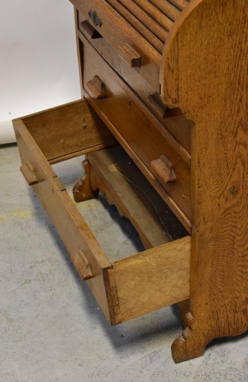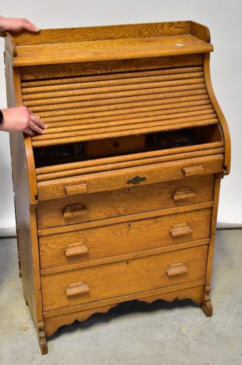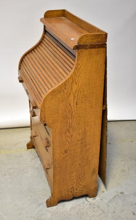 Lot 19 of 873: An early 20th century oak roll-top desk of diminutive proportions, with three-quarter galleried top above tambour-fronted section enclosing a fitted interior, above a base of three drawers with shaped apron, to bracket feet, 117 x 73 x 38cm (af).