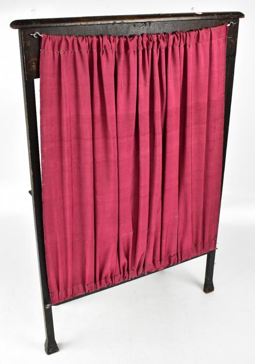Lot 22 of 873: An early 20th century Arts & Crafts fire screen with Art Nouveau inlay to centre panel, red silk curtains to back, 78 x 54cm.