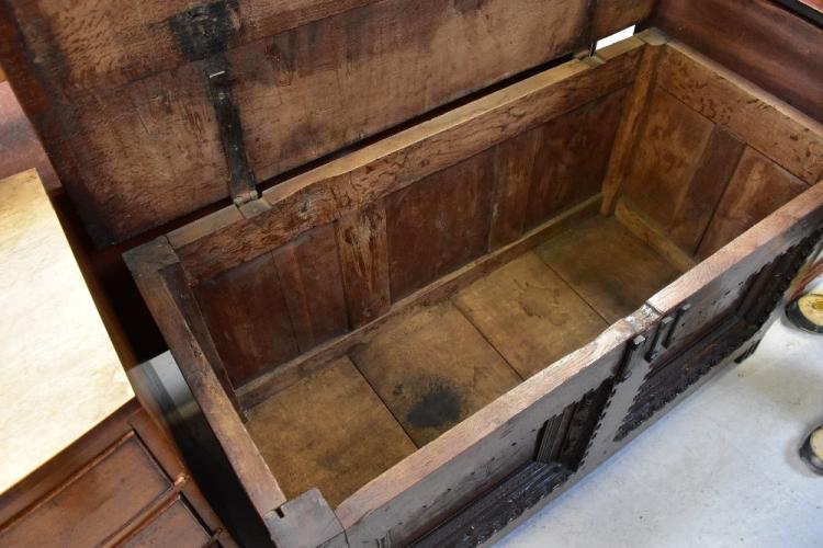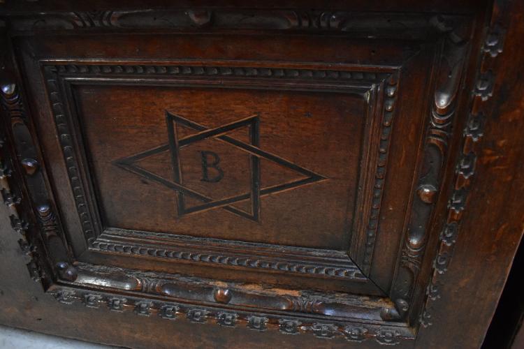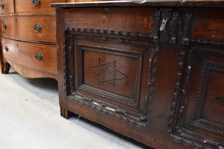 Lot 23 of 873: An 18th century and later two-panelled coffer with later carved decoration to the panelled surrounds and further replaced panels inscribed with a stylised 'A' and the letter 'B' within a six-pointed star, raised on later reeded feet, 63 x 125 x 57cm.