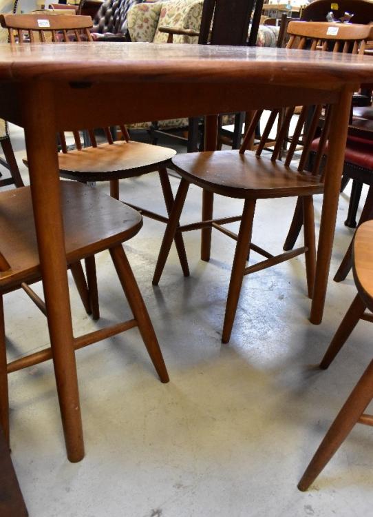 Lot 27 of 873: A set of four stick-back dining chairs raised on turned tapering cross stretchered supports and a drop-leaf table (5).