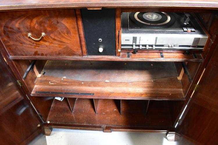 Lot 33 of 873: A reproduction crossbanded mahogany two-door side cabinet, later converted to a hi-fi cabinet, containing a Philips turntable, an amplifier switch and single drawer, the lower portion has had the drawers removed and re-fashioned to house a speaker (which is not present) and the bottom drawer has had dividers for record storage put in, raised on outswept bracket feet, 116 x 110 x 51cm.