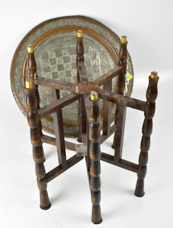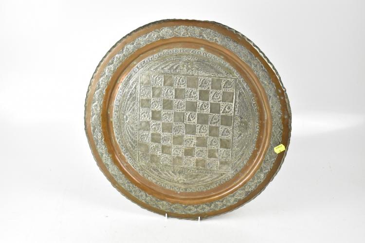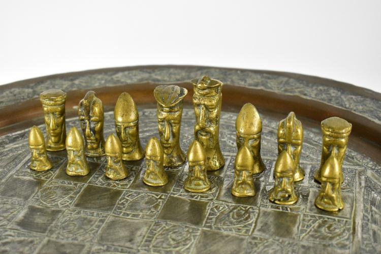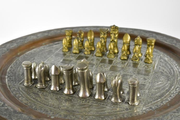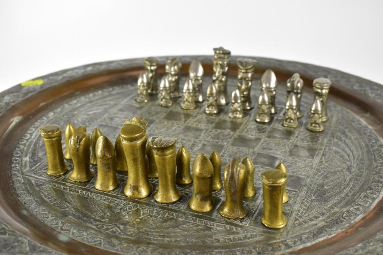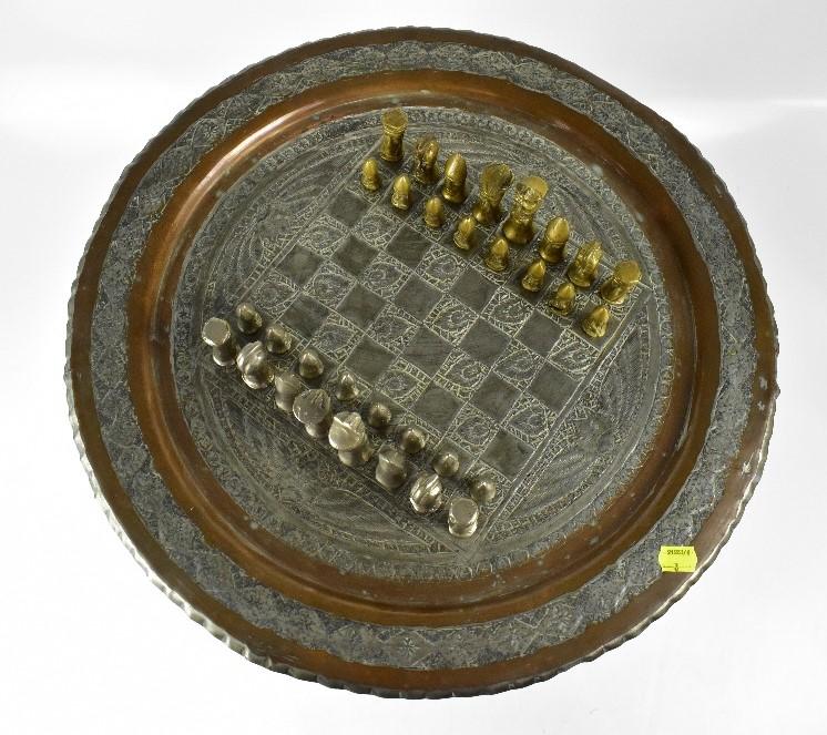Lot 37 of 873: A Middle Eastern style tinned and copper circular tray-top table, with embossed chessboard centre, together with a set of brass and pewter chess pieces in the Gothic style, diameter of tray top approx 50cm.