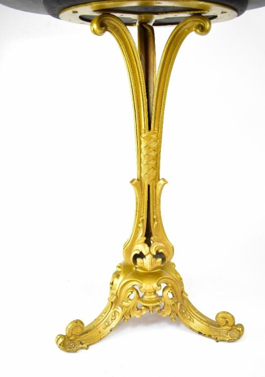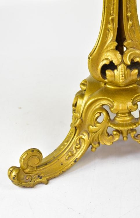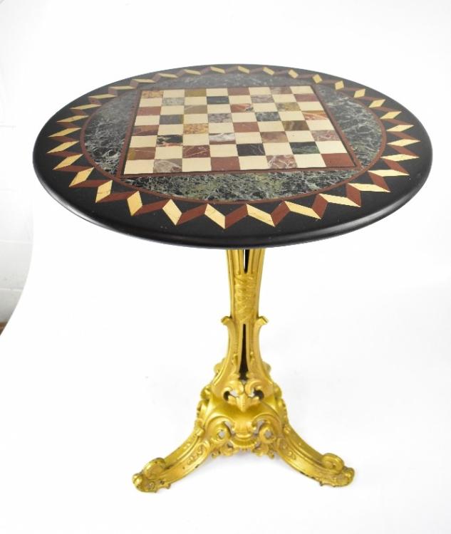 Lot 40 of 873: A late 19th/early 20th century Italian round marble chess table with pietra dura top with veined green marble, central chess board and trompe l'oeil block design to the edge of the table, on ornate metal gilded stand, tapering central column to three outswept supports, 74 x 52cm.