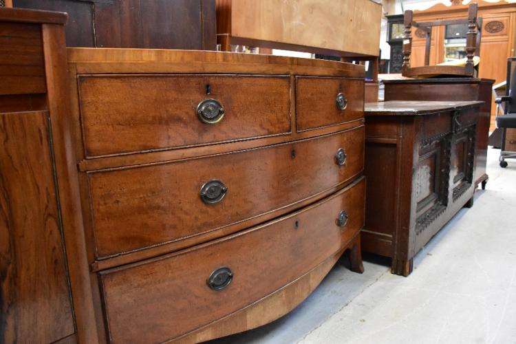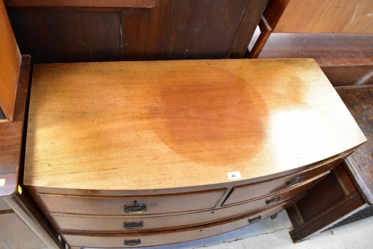 Lot 46 of 873: A Georgian mahogany bow-fronted chest of two short and two long drawers, with shaped apron and raised on outswept bracket feet, 80 x 107 x 48cm (af).