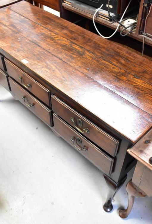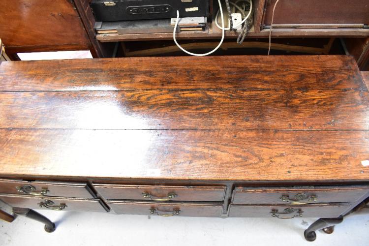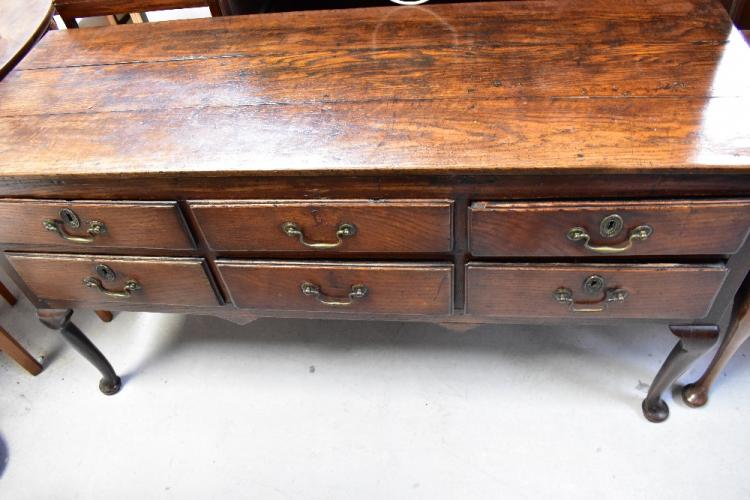 Lot 48 of 873: A George III oak dresser base, the plank top above six short drawers, raised on cabriole legs to pad feet, 76 x 144 x 53cm.