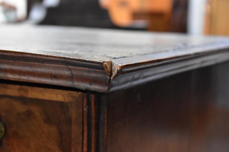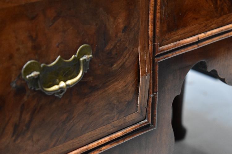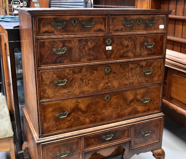 Lot 50 of 873: A George III burr walnut chest on stand, the upper section with two short drawers above three long drawers, above a kneehole base section of single central drawer flanked by a pair of deep drawers, above shaped apron, raised on cabriole supports to pad feet, 153 x 100 x 55cm.