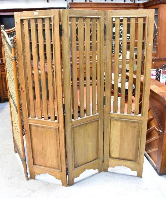 Lot 52 of 873: A contemporary bamboo and wicker three-leaf two-fold screen and a further pine example, approx 183 x 135cm (2).