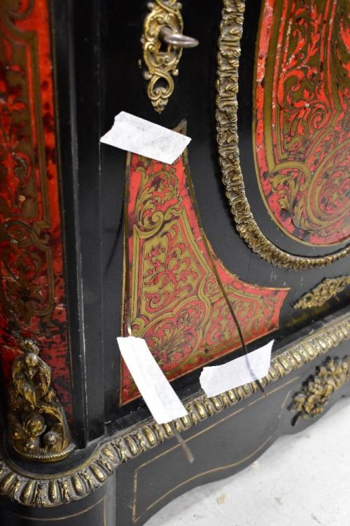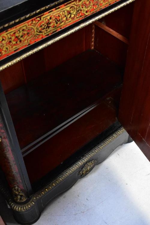 Lot 60 of 873: A 19th century ebonised gilt brass mounted boulle work side cabinet, with single door centred with an oval boulle work panel, within a gilt brass border, above a brass inlaid shaped plinth centred with a further gilt brass floral arrangement, 111 x 87 x 42cm (af).
