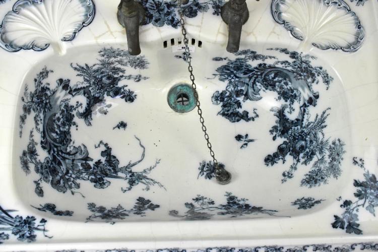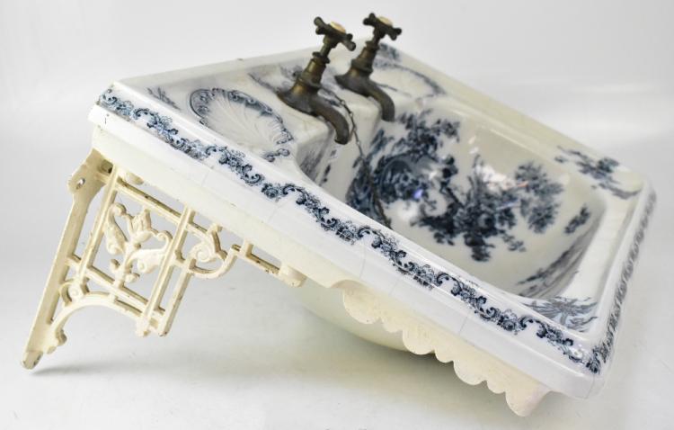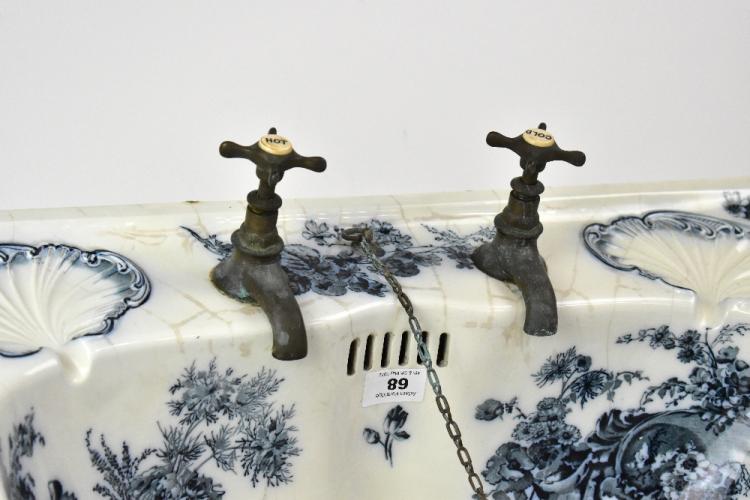 Lot 68 of 873: JOHNSON BROS (HANLEY) LTD; a Victorian blue and white decorated wash basin, with pair of built-in scalloped soap dishes to the back plinth and further fitted with brass taps and plumbing, mounted on a white painted cast iron wall bracket, stamped to underside with maker's mark, further stamped with a crest and '69A,02,24,4', width 66cm, depth 44cm (af).