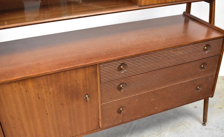 Lot 4 of 1054: NATHAN; a mid-20th century 'Highboard' sideboard, with upper glazed sliding door section, with drop-down cupboard door above a base of three long drawers with linear fronts and a plain cupboard door with label to interior, all with tapered metal handles, on square legs, 126 x 137 x 45cm.