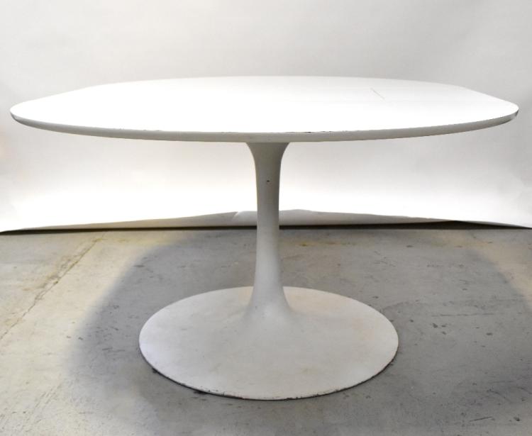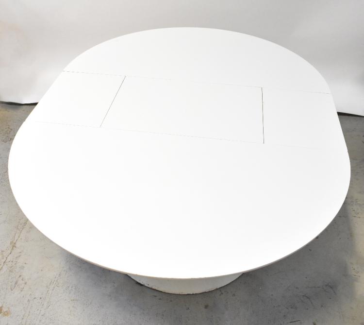 Lot 8 of 1054: MAURICE BURKE FOR ARKANA; a 1960s white extending tulip table, with metal pedestal base and single integral fold-out leaf, 71.5 x 161.5 x 121cm, and a set of four matching plastic chairs with metal bases (lacking cushions) also two similar chairs with plastic seats and turned stretchered supports (4+2) (7) .