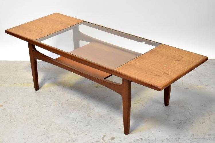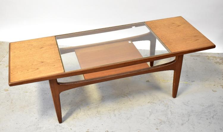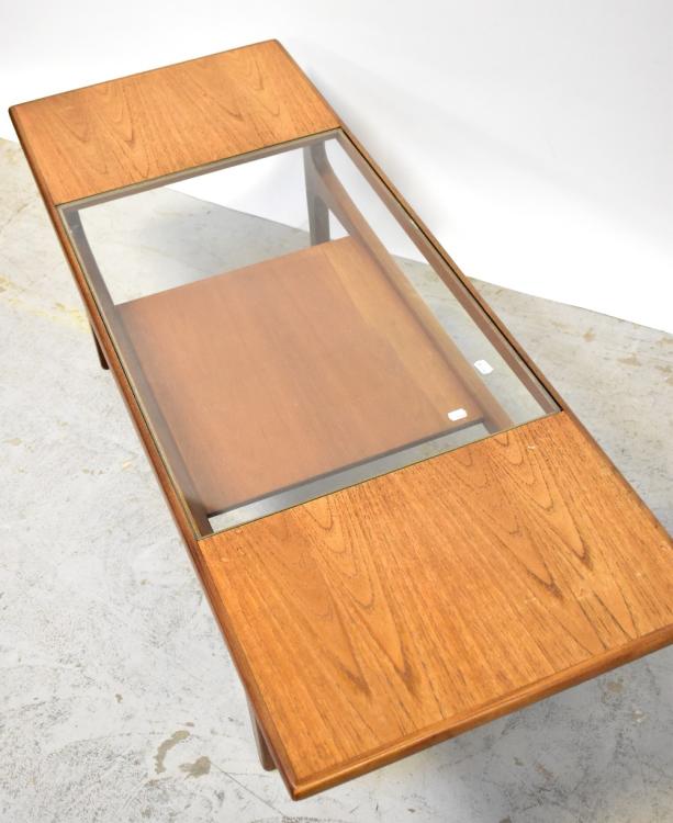 Lot 9 of 1054: G-PLAN; a retro teak glass-topped two-tier coffee table, 43 x 137 x 50cm.