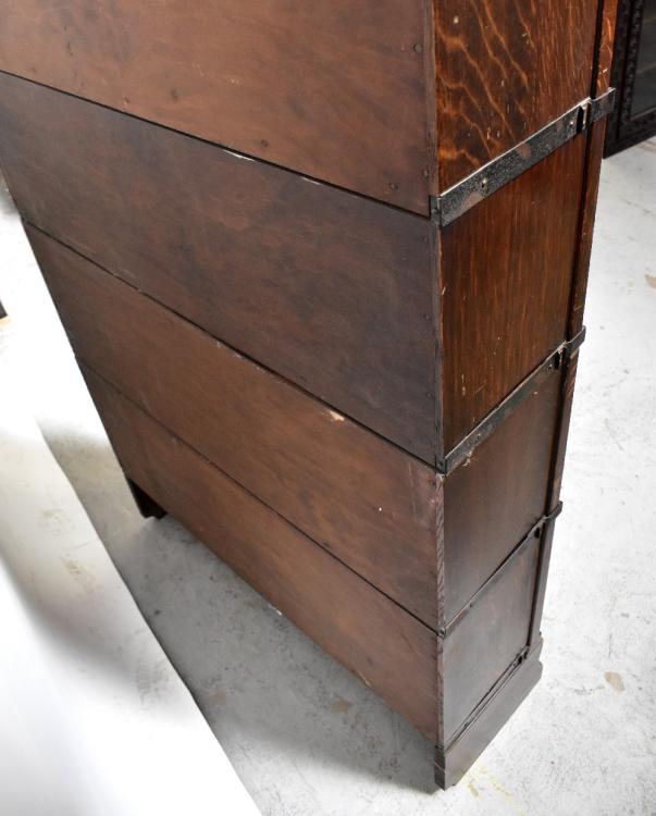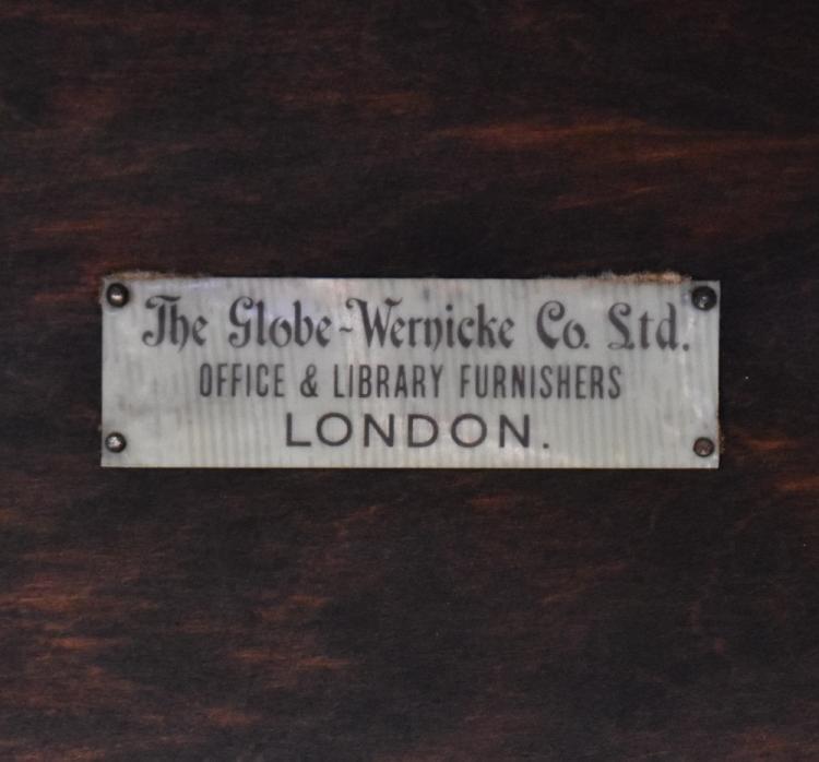 Lot 10 of 1054: GLOBE WERNICKE; an oak four-tiered bookcase, each tier with glazed door, ivorine labels to each tier, on plinth base, 144 x 86 x 28cm.