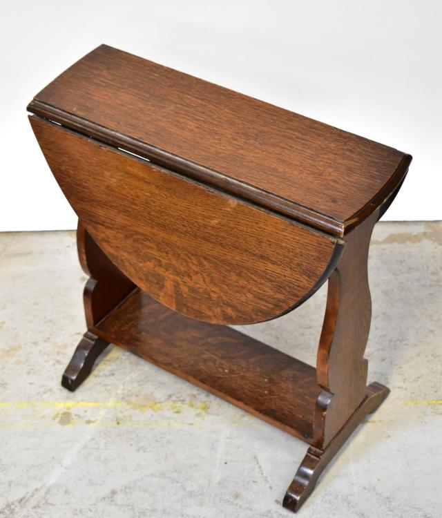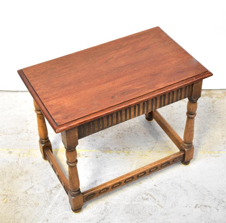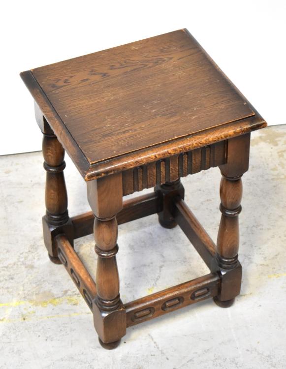 Lot 12 of 1054: Five various occasional tables comprising a reproduction joint stool, a drop-leaf table, a joint stool style coffee table, a teak coffee table, also a reproduction oak plank-top chair with shaped back with pierced heart motif, on turned legs and a mahogany wine table with lipped top (6).