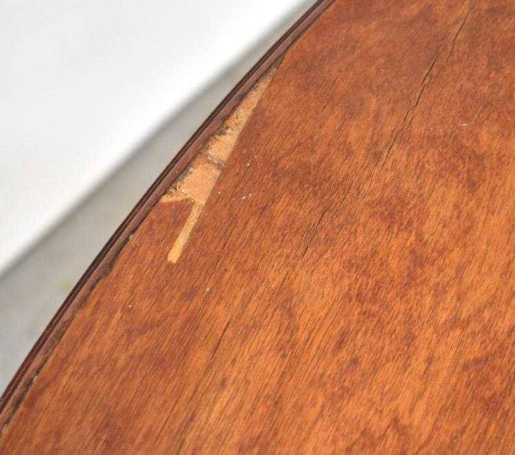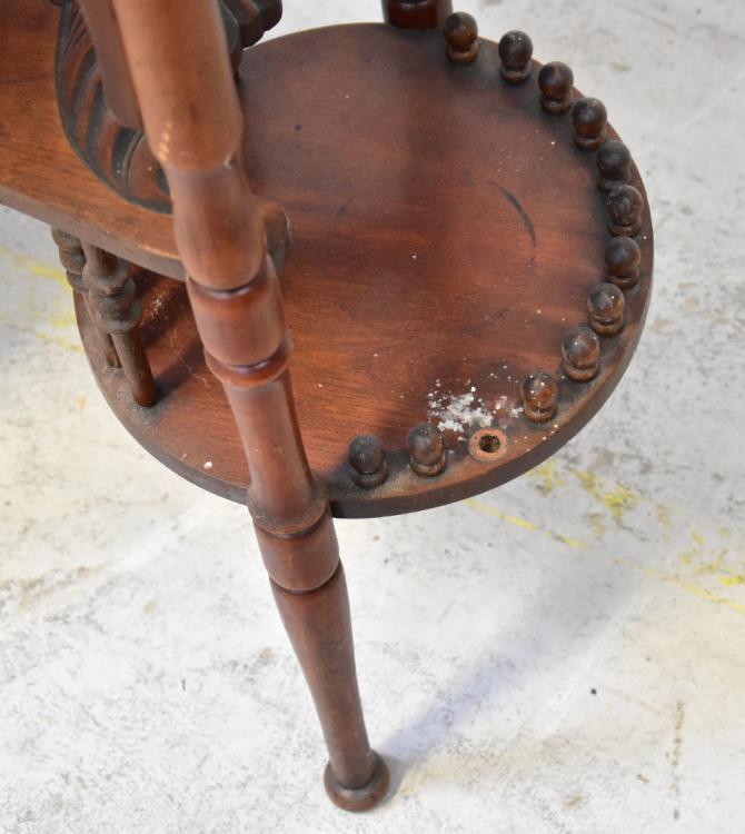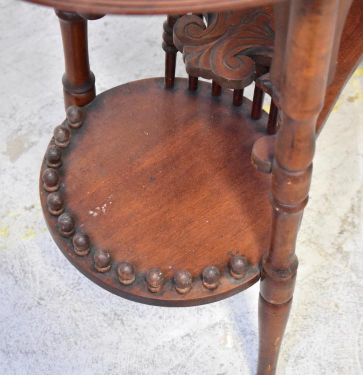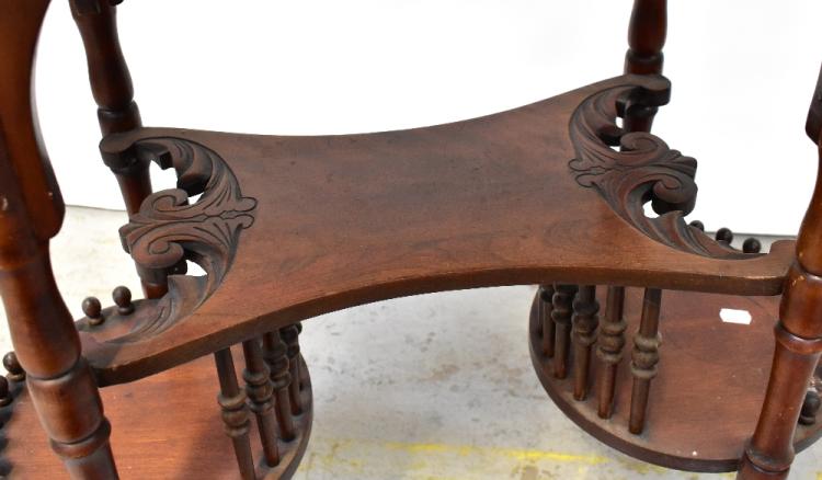 Lot 21 of 1054: An Edwardian mahogany oval top writing table, possibly American, with carved and shaped undershelf, with two further circular tiers with bobbin turned supports, on turned tapering legs, 74 x 84 x 46cm.