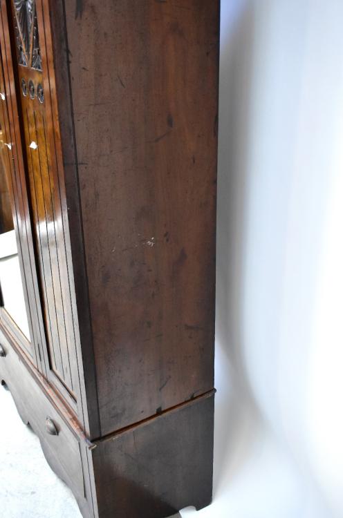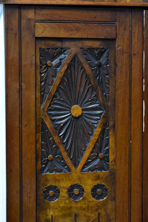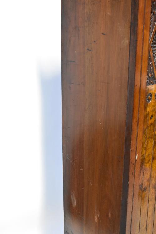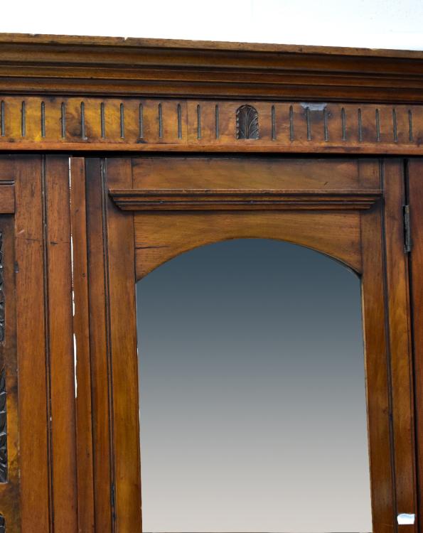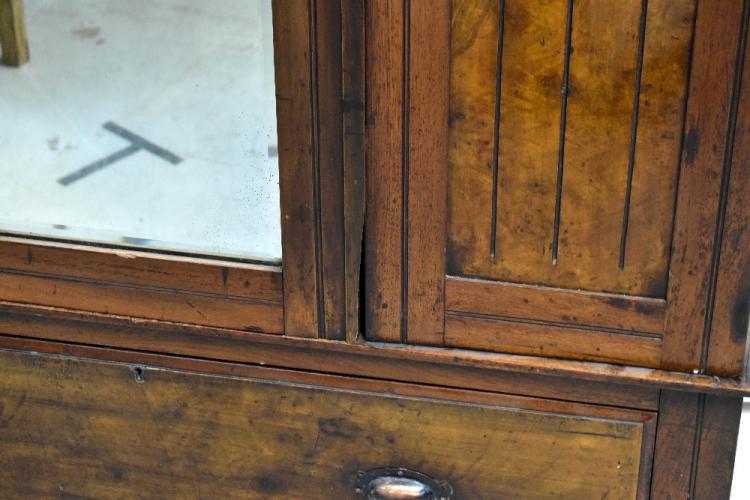Lot 25 of 1054: An Edwardian mahogany and walnut single-door wardrobe, stepped frieze above central mirrored door, carved foliate walnut panels to either side, above long single drawer, to stepped plinth base, 194 x 120 x 43cm.