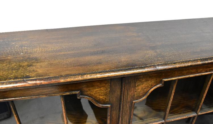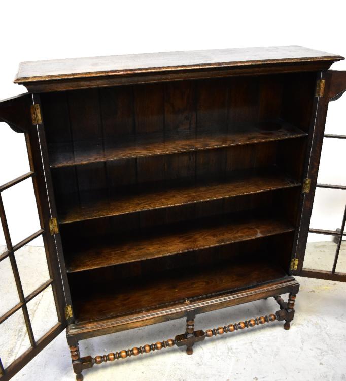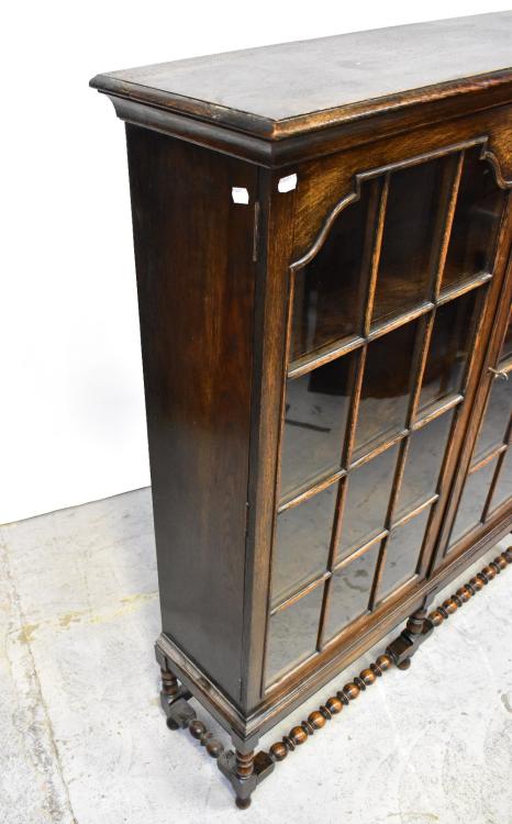 Lot 29 of 1054: An early 20th century oak two-door glazed display cabinet, raised on bobbin turned and block stretchered supports, 138 x 115 x 31cm. Footnote: From the estate of local architect Herbert Rowse, famous for the design of Martins Bank, the Philharmonic Hall, the India Buildings and the Mersey Tunnel Air Duct.