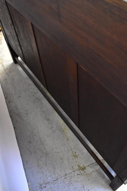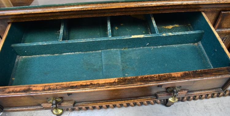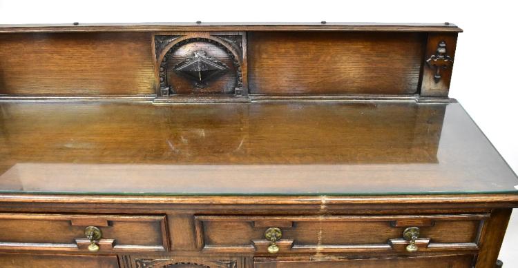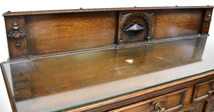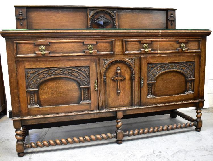 Lot 34 of 1054: A Victorian oak sideboard, the raised back centred with a carved arch around a lozenge-shaped motif, above a base of two long drawers and pair of panelled doors with carved detail, raised on block and barleytwist stretchered supports, 130 x 184 x 60cm. Footnote: From the estate of local architect Herbert Rowse, famous for the design of Martins Bank, the Philharmonic Hall, the India Buildings and the Mersey Tunnel Air Duct.
