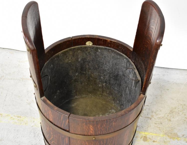 Lot 46 of 1054: A lidded tub stool fashioned from a brass bound oak coopered barrel, height 63cm, diameter 44cm.