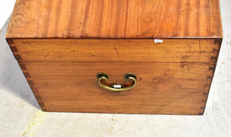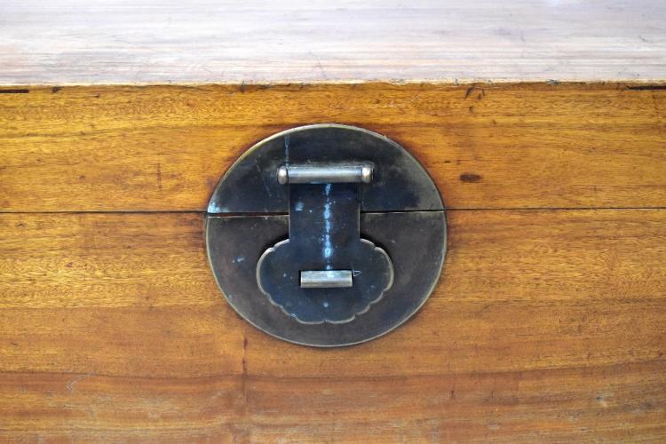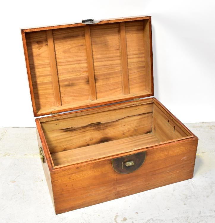 Lot 49 of 1054: A large Chinese-style chest, the hinged lid secured by a large brass circular locking mechanism to the front and further drop loop handles to the sides, 48 x 101 x 66cm.