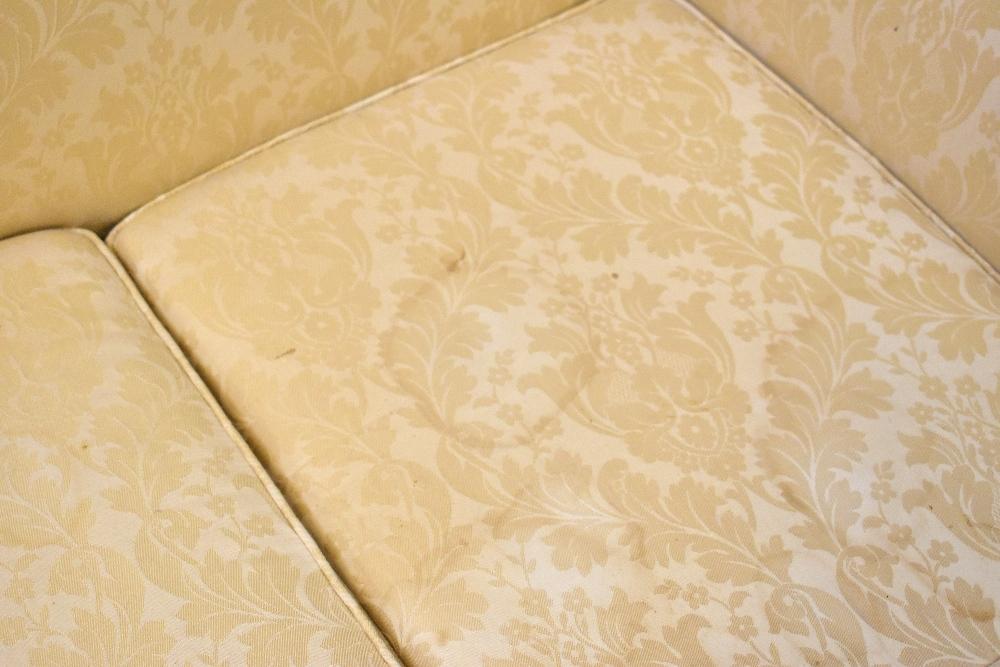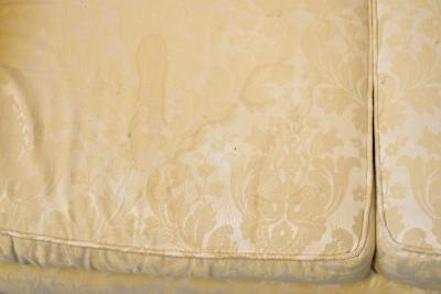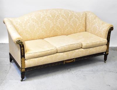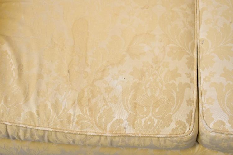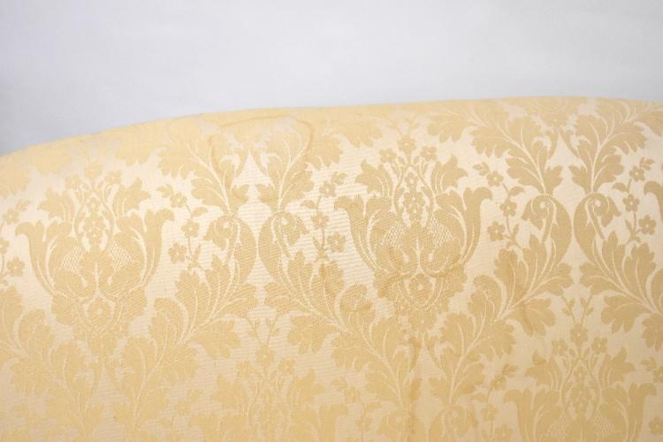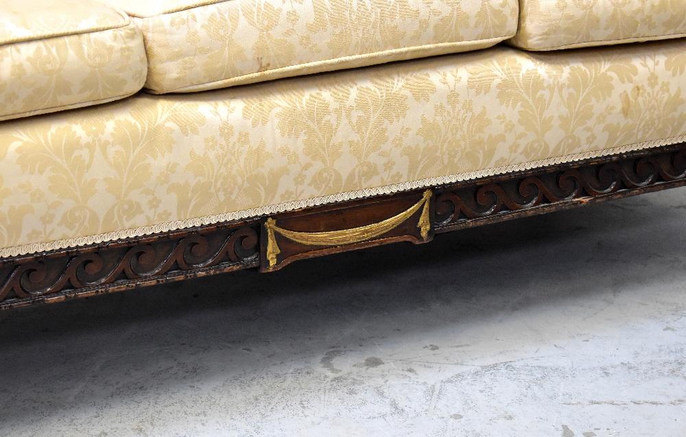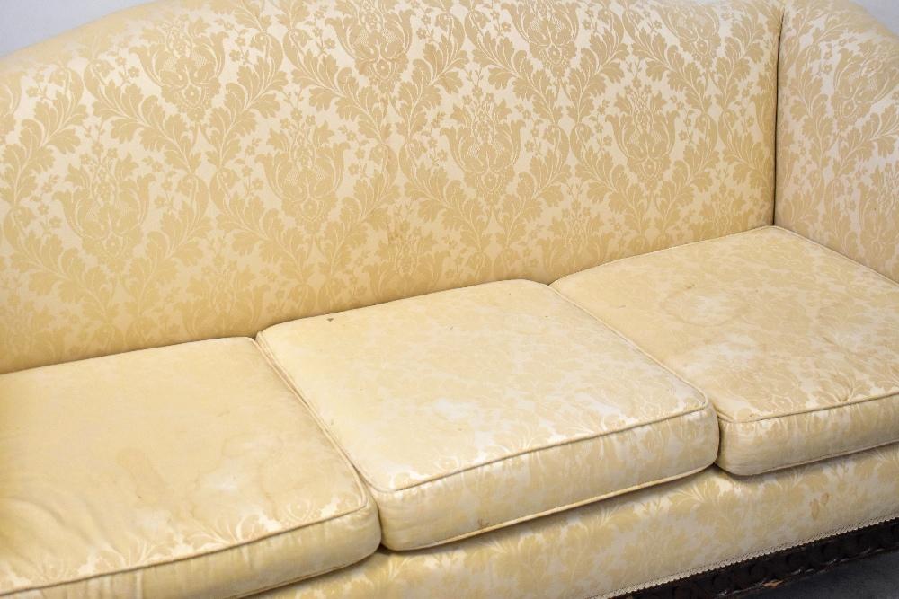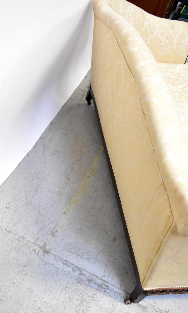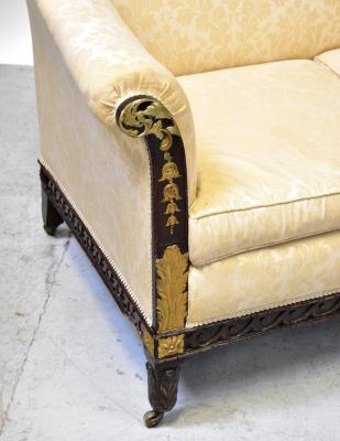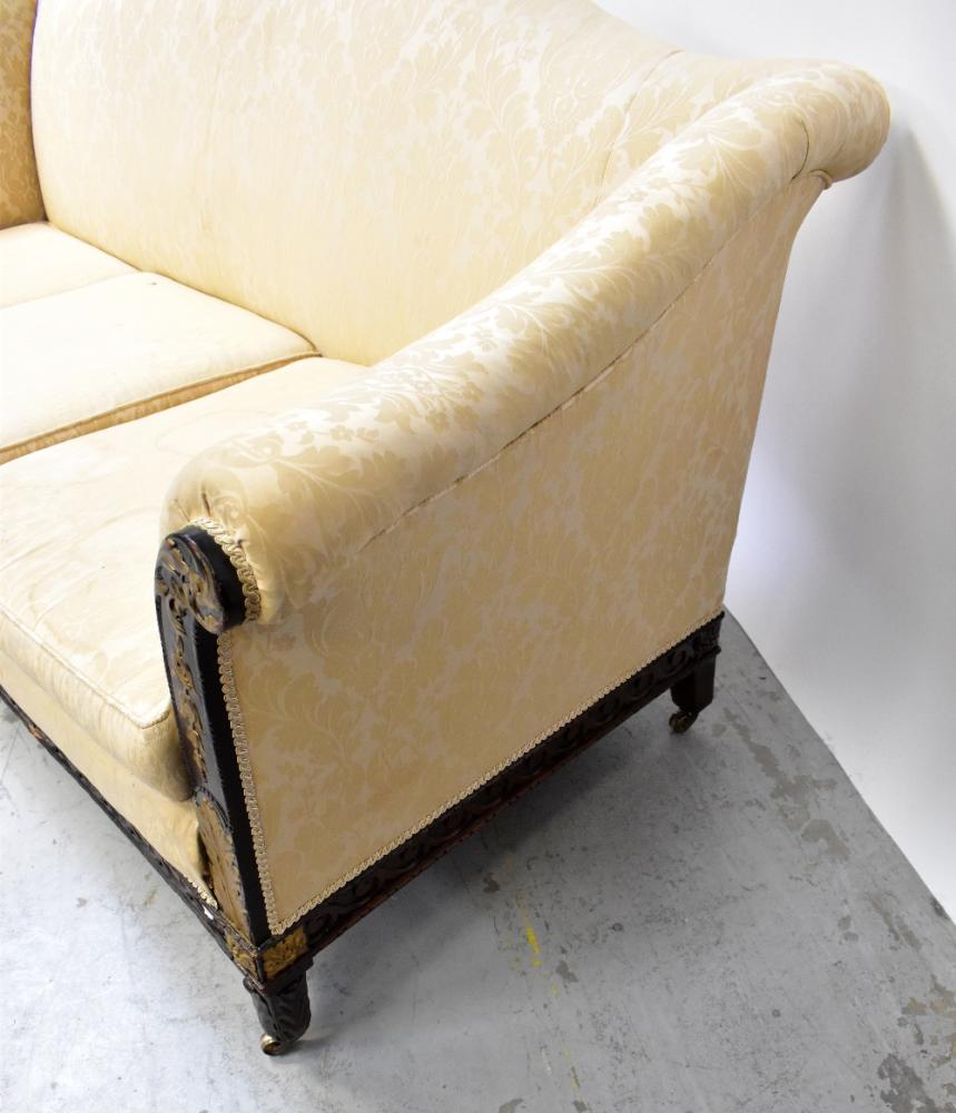Lot 62 of 1054: A 19th century mahogany-framed three-seat settee, with scroll arms and serpentine back, upholstered in cream damask fabric, the frame carved and gilt-heightened with acanthus leaf and foliate motifs, on turned acanthus leaf carved legs to castors, 92 x 186 x approx 90cm.