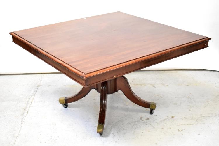 Lot 63 of 1054: A 19th century mahogany square tilt-top table, raised on ring turned column to four outswept scrolling supports to brass caps and castors, approx 74 x 122 x 116cm (af).