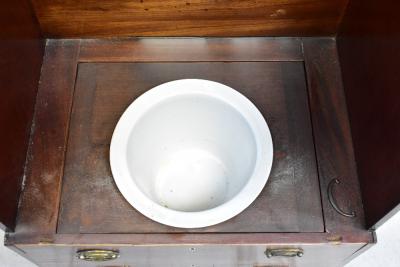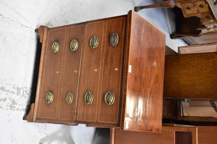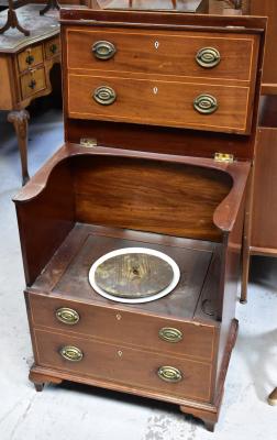Lot 64 of 1054: A 19th century mahogany line inlaid commode in the form of a four-drawer bachelor's chest, the hinged upper section opening to reveal a ceramic liner with lid, raised on bracket feet, dimensions when closed 77 x 64 x 45cm (af).