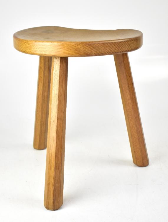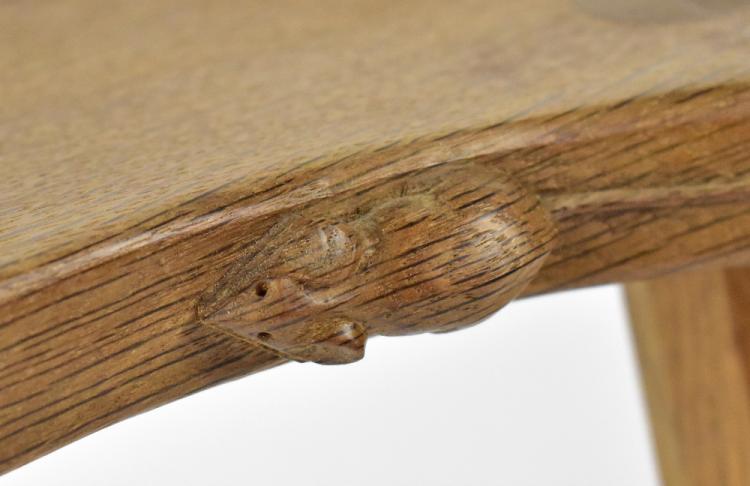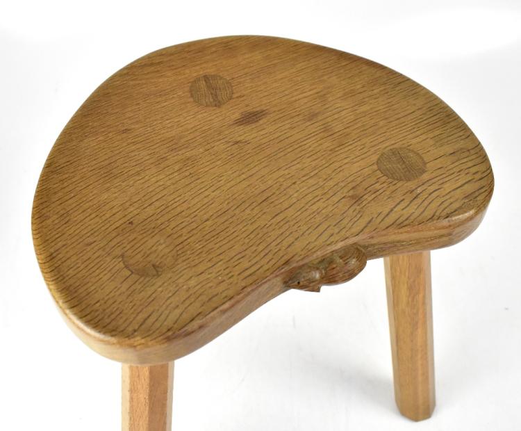 Lot 1 of 1434: WORKSHOP OF ROBERT 'MOUSEMAN' THOMPSON; an oak stool with dished kidney-shaped seat and octagonal tapering legs, height 36cm.
