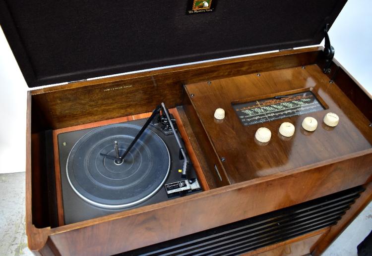 Lot 31 of 1434: A vintage His Master's Voice record and radio cabinet comprising a Garrard model 3500 turntable and tuner, over speaker section and lower storage unit, in mahogany veneered case, 81 x 90 x 44cm.