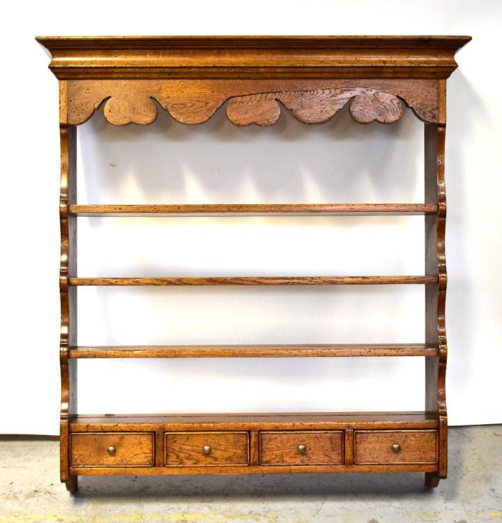 Lot 37 of 1434: TAYLOR & CO; a 20th century good oak reproduction small open backed dresser, with shaped pelmet over four shelves, over four small drawers, on two cabinet base with under-shelf, on vase turned supports, 185 x 106cm