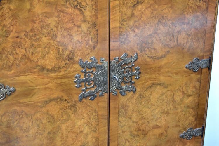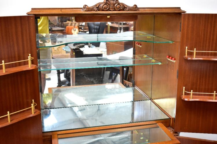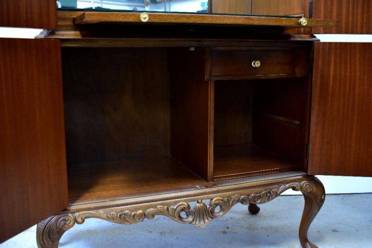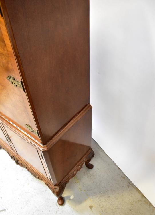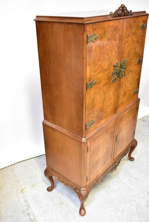 Lot 43 of 1434: A reproduction walnut veneered cocktail cabinet, the upper section interior with mirror back and glass shelves, with two small shelves to each door and pull-out mirrored serving tray, over two-door cabinet, on ornate carved base raised on cabriole supports, 152 x 93 x 45cm.