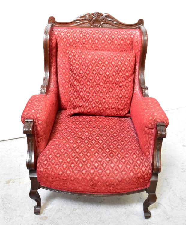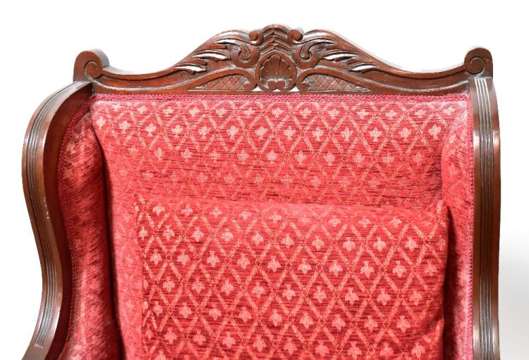 Lot 44 of 1434: A reproduction walnut framed armchair with red upholstery and carved acanthus leaf decoration, raised on cabriole front supports.