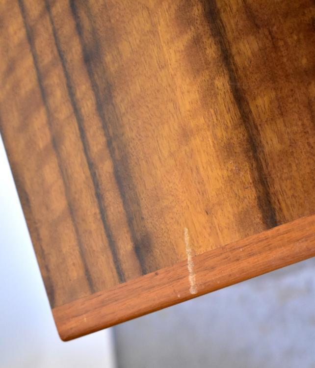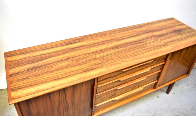 Lot 52A of 1434: MORRIS OF GLASGOW; a 1970s teak sideboard with central bank of four graduated drawers flanked by two cabinets, on cylindrical turned supports, 74 x 164 x 46cm.