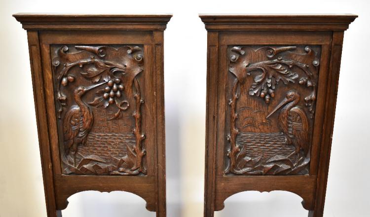 Lot 54 of 1434: A pair of late Victorian carved oak hall chairs, each panelled back decorated with a stork, with plank seat and turned and block front legs (2).
