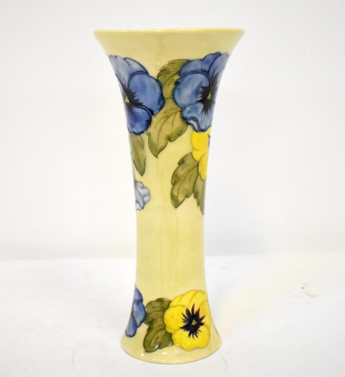 Lot 353 of 1434: MOORCROFT; a tall trumpet-shaped vase with cylindrical body and flared rim, decorated with tube-lined colourful pansies and leaves, on a faint green ground, impressed factory marks and paper label to the base, height 27cm.