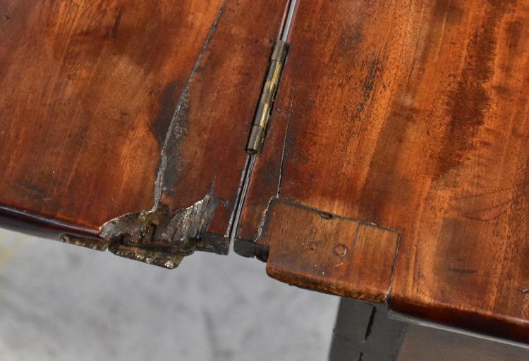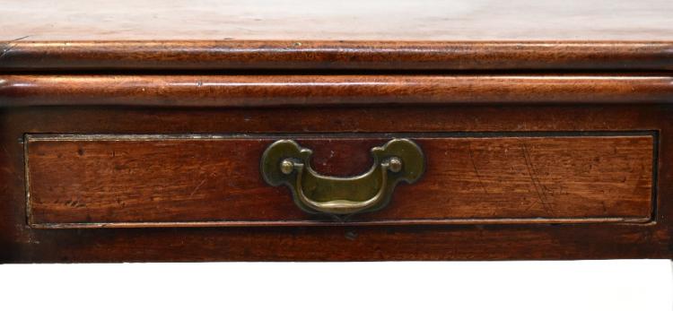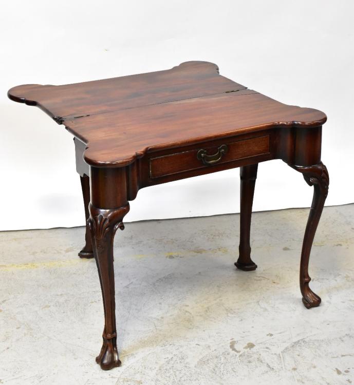 Lot 4 of 1032: A George II mahogany fold-over tea table, early 18th century, the top with rounded outset corners, over single drawer, raised on four cabriole legs with carved acanthus leaves to the knees, terminating in paw feet (three fixed, one gateleg), when extended 71 x 83 x 82cm.