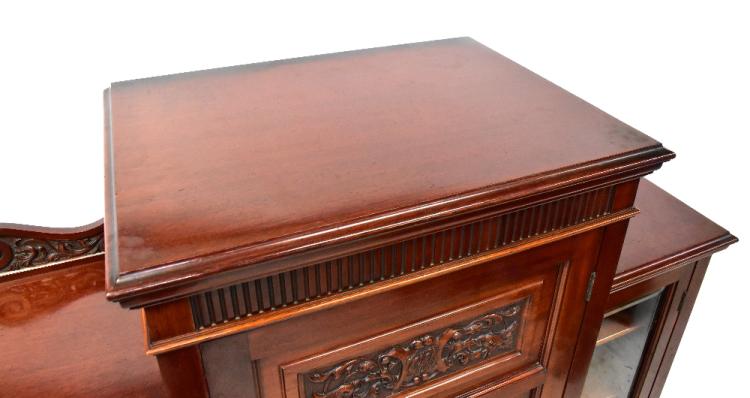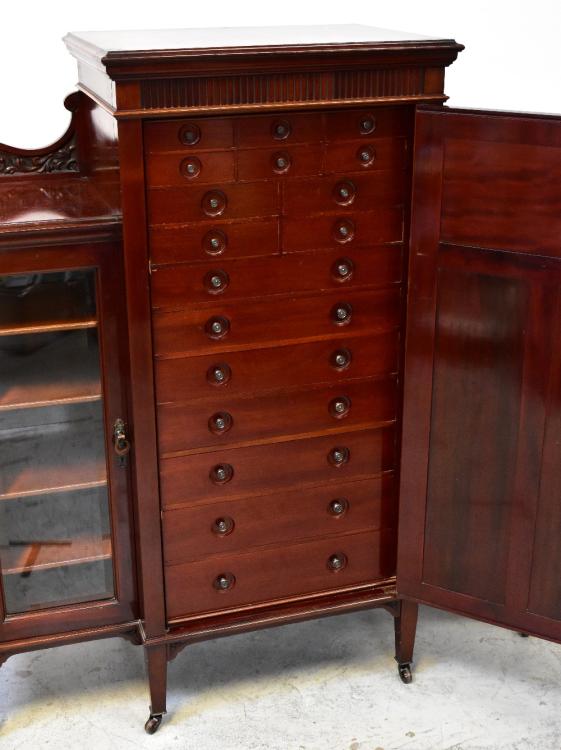 Lot 14 of 1032: A Victorian mahogany surgical cabinet, the central panel door with carved motif to the upper section, centred with the vendor's grandfather's initials, enclosing an assortment of airtight drawers of various sizes for surgical equipment, flanked by bevelled glass airtight doors with adjustable shelves, raised on square tapering supports to brass caps and castors, 147 x 143 x 51cm.